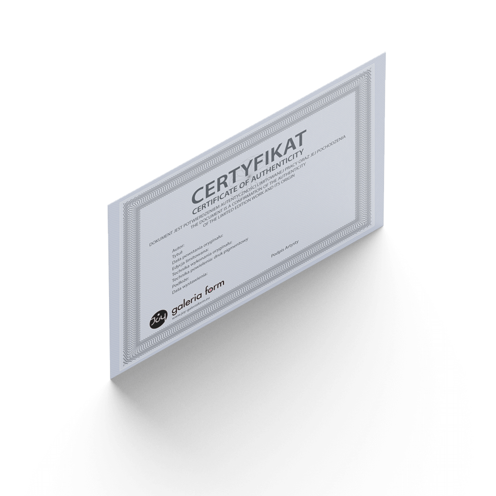 Grafika Fine Art na podłożu twardym w formie fotoboard. Praca nie wymaga oprawy i jest gotowa do zawieszenia. Edycja limitowana, każdy egzemplarz sygnowany i posiada certyfikat autentyczności.